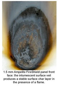 Ampelite FireShield panels tested showed no perforation through the laminate and immediate self extinguishing following flame removal. Temperature monitoring of Ampelite FireShield panels showed reduced back face temperatures, indicating lower heat transmission and reduced risk of fire spread.
